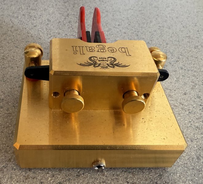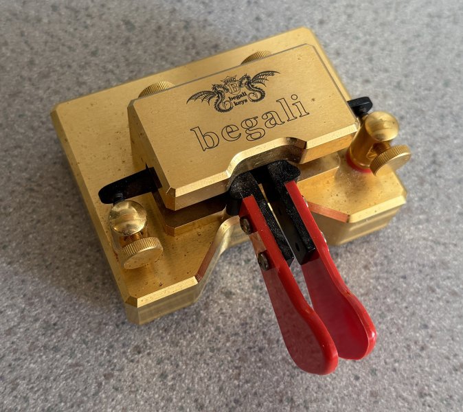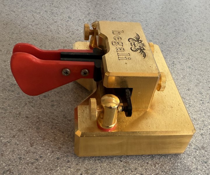 Velholdt Begali Signatur Edition Gold 1043# - en magnetisk kvalitets paddle. Produceret af I2RTF Begali i Italien, som fremstiller nogle af verdens mest udbredte præcisions produkter. Der er monteret plastik finger-vinger og der medfølger to ekstra sæt i sort aluminium. Desuden medfølger præcisionsmåler til justering af nøglen. Nyprisen ligger på cirka 2.800 kr.