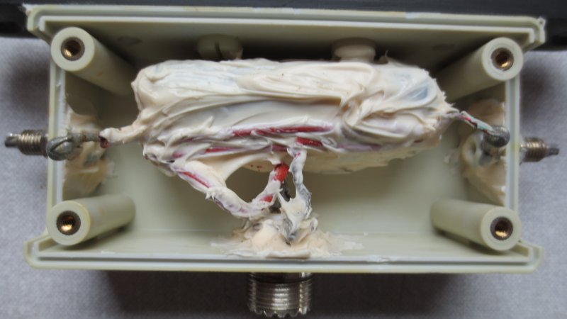 Hjemmelavet Balun 1:1 viklet på fertilkerne og monteret i vandtæt box med ophæng og loddeører til tråden. Indgang er et SO239 stik. Tilført effekt SSB-200W og CW-100W.