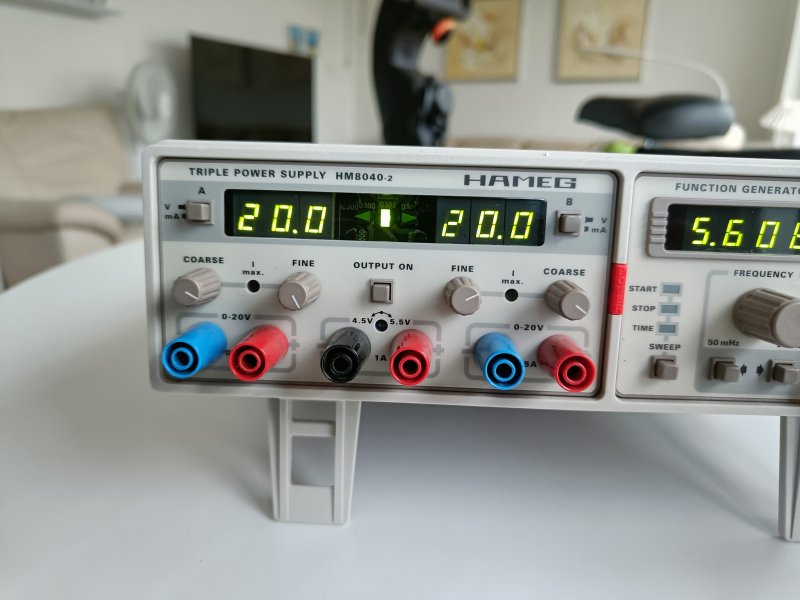 Strømforsyning er 2 stk 0-20V 0.5A samt 1 stk 5V 1A. Funktionsgenerator er 5 MHz.