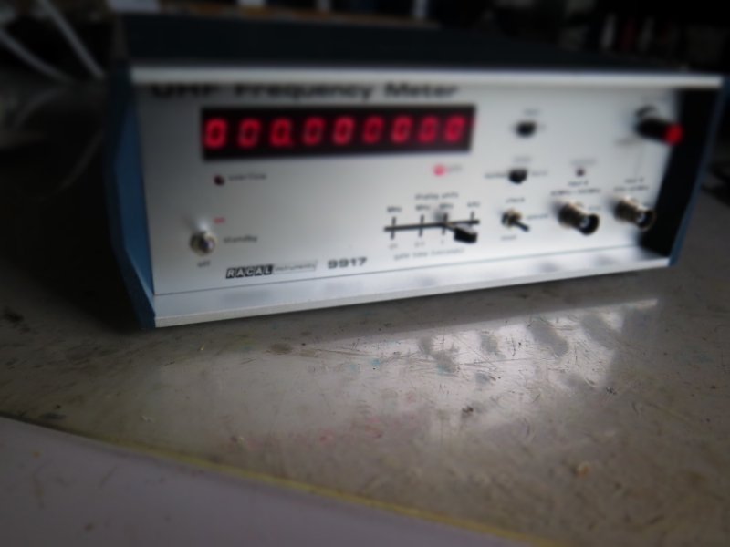 Frekvenstæller fra Racal type 9917, med 9 cifre (rød LED) går fra 10 Hz op til 560MHz og med krystalovn. . - Kan medbringes til ODENSE ATF 2 november.