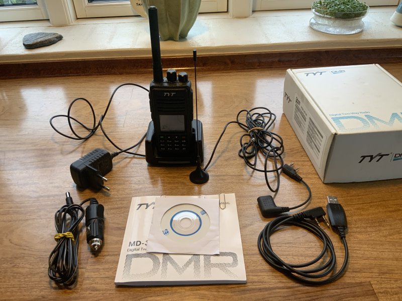 Komplet TYT DMR radio med bordlader, mobilantenne, programmering kabel , CD-rom , manual og org. Æske