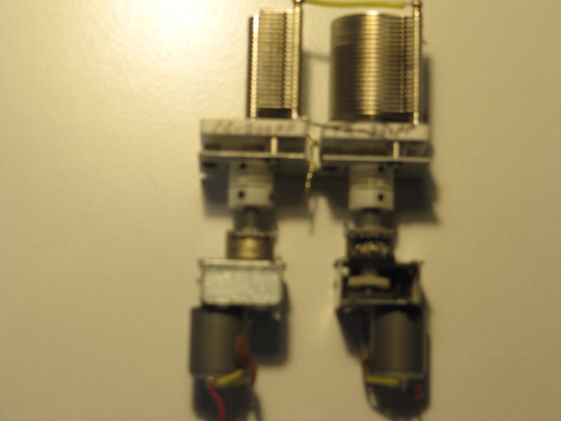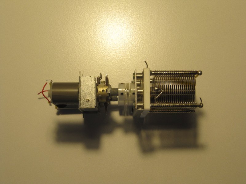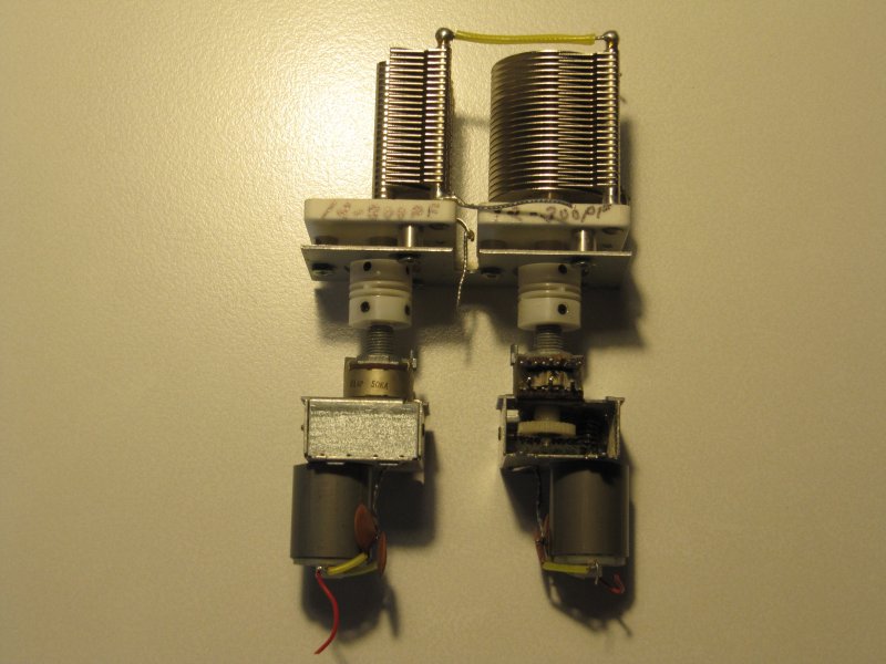 2 stk. Motorbetjente drejekondensatorer. 12-300 pf. Motorerne er 12 volt og der er en 50 K ohm pot. meter som kan bruges til at vise indstillinger.