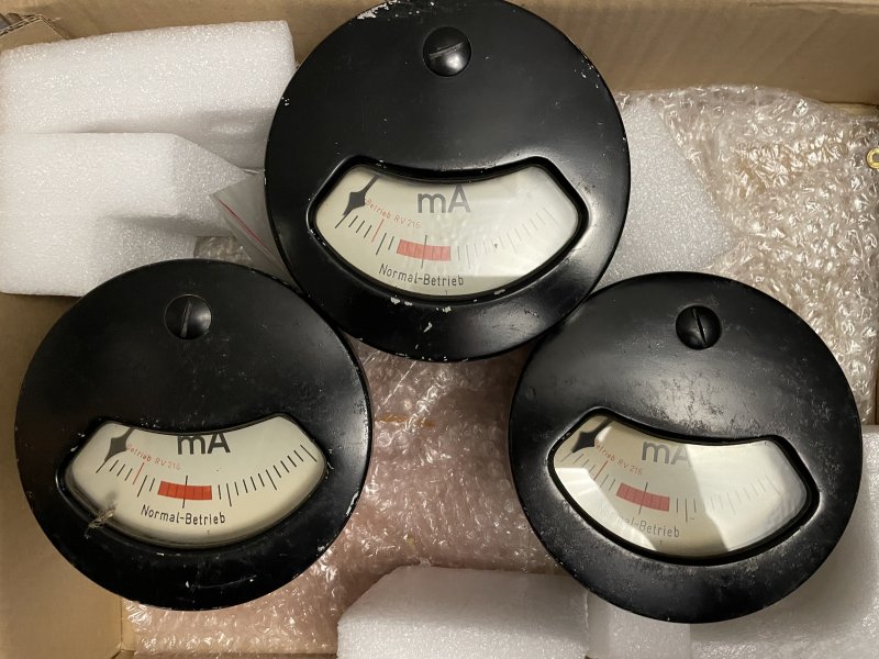 Tre store milliamperemeter ca 12 cm i diameter med 10mA for fuldt udslag - alle virker.