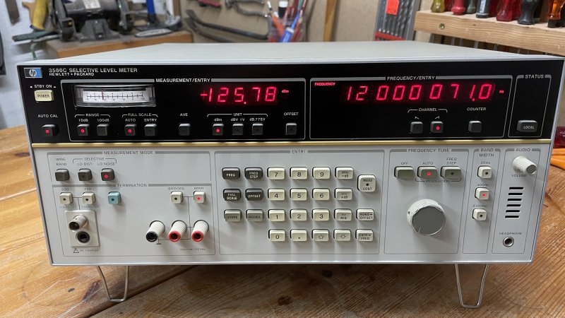 HP 3586C Selective Level Meter 50 Hz til 32,5 MHz. Har både 50, 75 og 600 Ohms indgang og kan måle level ned til ca. -127 dBm. Den er perfekt til at tjekke level step nøjagtighed på sin Signal Generator op til 32 MHz eller kalibrere sine attenuatorer. Bare for at nævne et par ting.