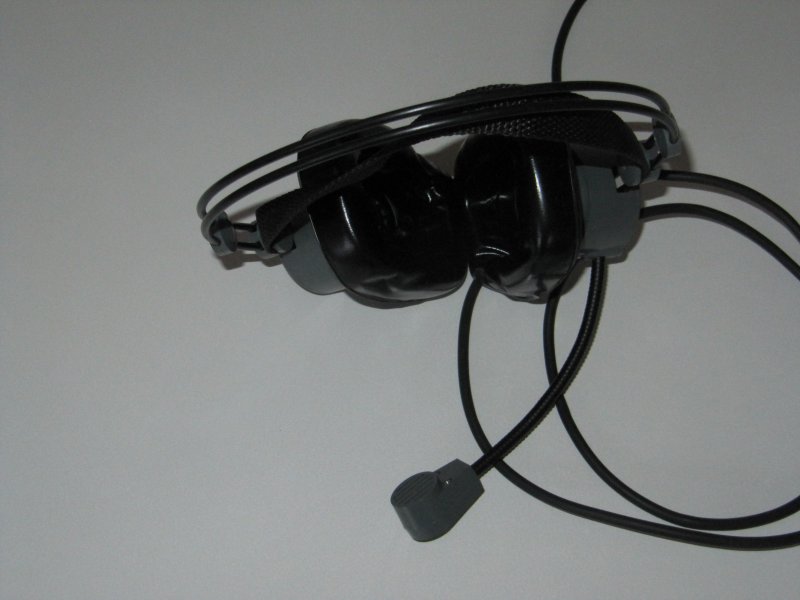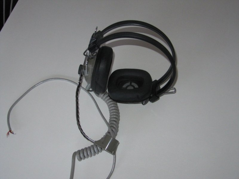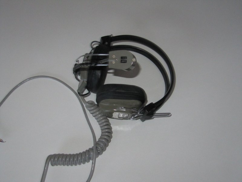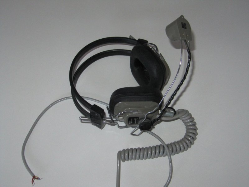 Headset med mikrofon. Det ene set er Hosiden Headset-microfon od der andet er et sæt fra en redningsbåd sender aldrig brugt.