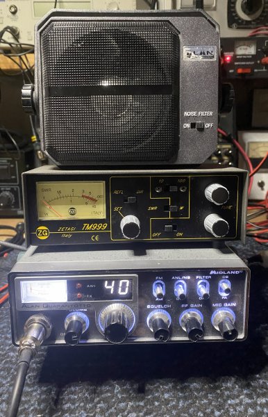FINT CB SET- MIDLAND QUARANTOTTO / ZETAGI TM 999 TUNER / WATT/SWR METER - EKSTRA HØJTTALER - KAN SENDES MED GLS