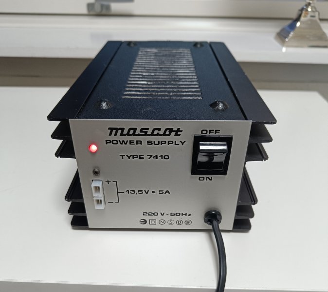 Mascot strømforsyning, model Type 7410. Output: 13,5V = 5A. Input: 220V - 50Hz. Spænding kan finjusteres internt. Vægt 3,9kg.