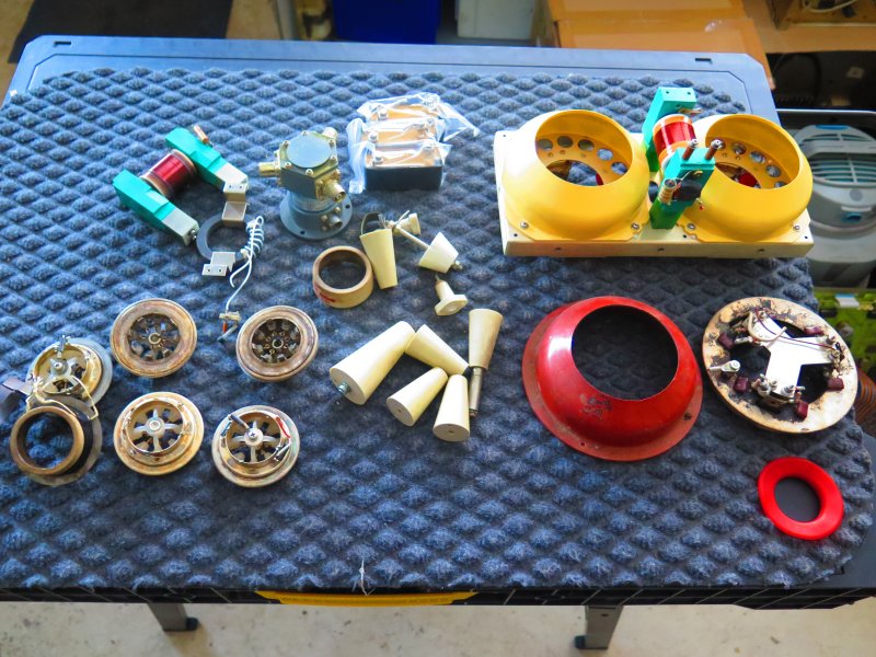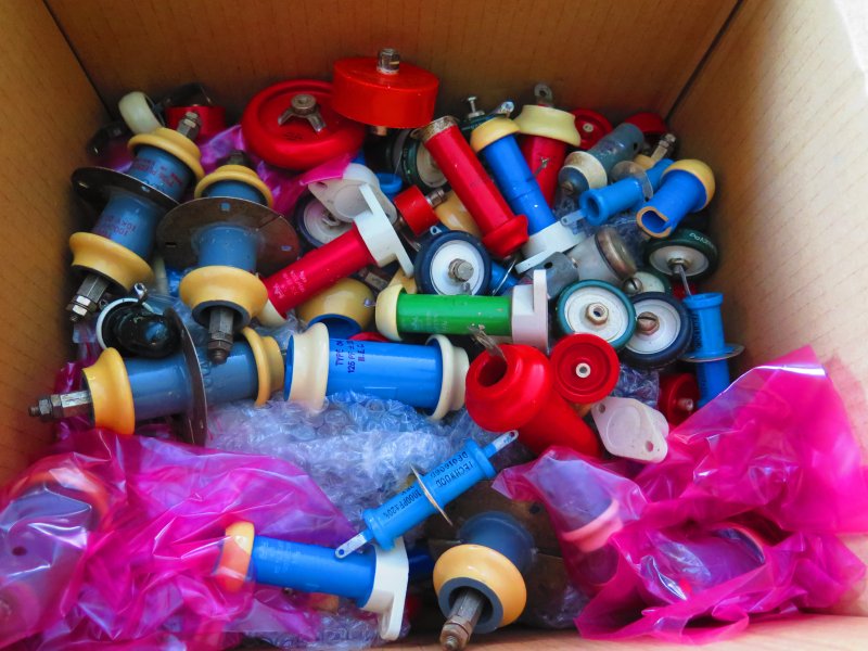 Har 4 kasser med gode dele for noget high power PA eller ATU - Her er Drejekondensatorer, Sporvogne/Rullespoler m. tælleværker, Jennings Vacum relæ, Keramiske omskiftere, Anodespoler, rør fatninger til keramiske rør, Keramiske spoler, doorknobs/keramiske kondensatorer. Der er 41 Kg i de 4 kasser, alene doorknop/keramiske kondensatorer vejer 18 Kg. Det hele sælges samlet. Kig billederne.