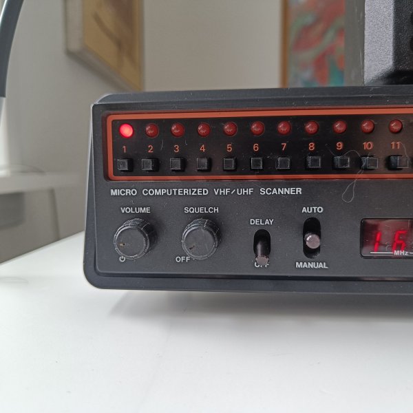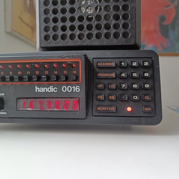 Dette er en Handic 0016 mikrocomputeriseret VHF/UHF scanner. Den har 16 programmerbare kanaler og et digitalt display, der viser frekvensen. Scanneren er udstyret med knapper til volumen, squelch og delay, samt en omskifter for auto/manuel funktion. Frekvensområderne er 68-88MHz, 144-174MHz og 420-512MHz. En ekstern højttaler fra Ericsson følger med. Produktet er fremstillet i Japan.