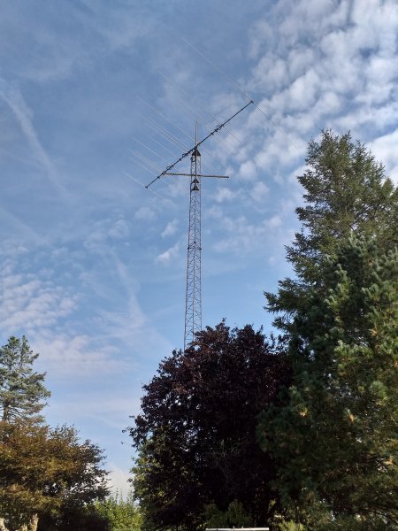 18 meter svær gittermast - 3 sektioner à 6 meter - med stor Force 12 antenne (se billeder). Desuden sidder en rotor deroppe. Kan overtages gratis imod nedtagning. Masten står på parcelhusgrund i Horsens og er placeret således, at en lastbil med kran kan holde i indkørsel og derfra nedtage mast. Kan hjælpe med kontakt til entreprenør med det rigtige udstyr.
