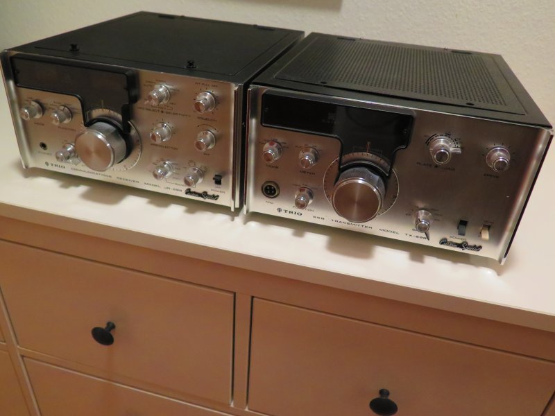 Trio/Kenwood JR-599 Custom Special HF modtager fra 1970, ægte vintage! Den er i pæn stand, der er ikke spor af, at der er skruet eller loddet i den. Det er en ”ikke ryger” og transistoriseret. Den originale VHF converter (for 2 meter) er monteret – og der er plads til en 6 meter converter lige så. Modtageren er i øvrigt med FM og Squelsh. Modtageren spiller, men trænger til en gennemgang med kontakt rens - og trimning? Køber man modtageren kan der gratis medfølge tilhørende sender; TX-599 Custom Special – den er defekt; nogen har klippet en del ledninger over inden i den?? og der mangler 2 stk. 6146 samt et stk 12BY7 rør i den – eller ser den komplet ud. Så har man lidt tålmodighed, kan den godt fikses. Der medfølger originale Operating manuals med til RX og TX, og en kopi af service manual til TX. Desuden og ganske sjovt er de originale salgspapirer med (danske) sættet blev sendt til Grønland i 1971. Kan medbringes til Agerskov...