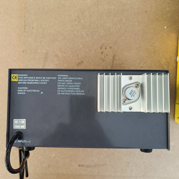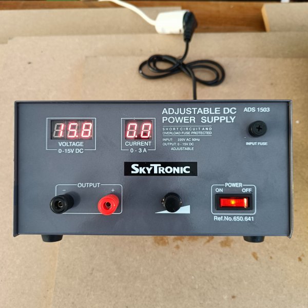 SkyTronic justerbar DC strømforsyning, model ADS 1503. Enheden har en spændingsudgang på 0-15V DC og en strømudgang på 0-3A. Den er udstyret med kortslutnings- og overbelastningssikring. Input er 220V AC 50Hz. Strømforsyningen har en tænd/sluk-knap og leveres med en instruktionsmanual.