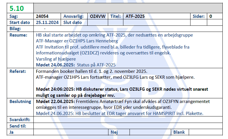Nu har jeg kigget på det vedhæftet billede flere gange og er stadig ikke blevet kloger. Der er en intention om at afholde ATF. Der er en intention om at booke hallen Der er en intention om at rette indbydelsen. Intentioner bringer jo ikke meget i sig selv. Har man faktisk booket halle, HAr udvalget faktisk haft et møde. Er indbydelserne faktisk lavet. Det ville give nogle svar. Så kan vi ikke springe referencerne til et mødereferat over og bare få at vide hvem der har fakta og spørge der ?? 73 de OZ1BZJ |