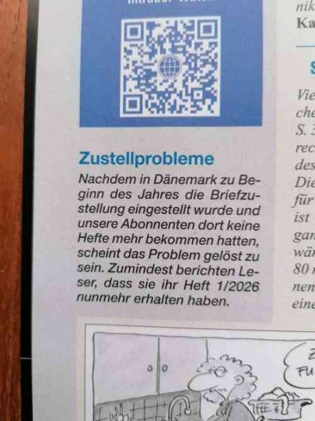 Mange tak for jeres respons. Det er godt at vide, jeg ikke er den eneste der oplever manglende blade. På den anden side er det ganske irriterende, at der skal være så langvarigt kludder i overgangen fra en operatør til en anden. Lige nu venter jeg pænt på erstatningsnummeret af FA 01/26. Jeg har i går købt nogle ting på Ebay (fra Tyskland) hhv. på Amazon.de, og nu er jeg spændt på, om der er det samme kludder med de forsendelser. Vy 73 Jørgen |